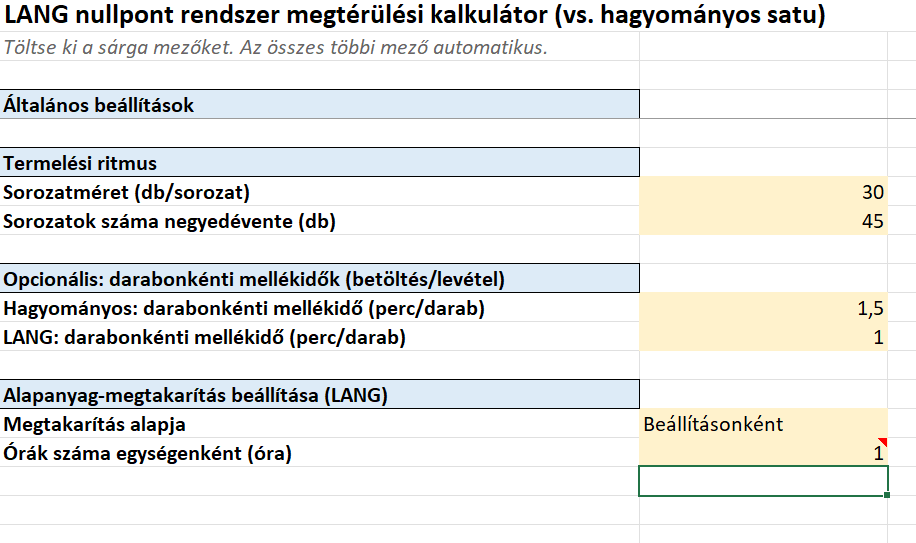 - Beállítási idők (perc) – mennyi idő egy átállás hagyományos és LANG megfogással.