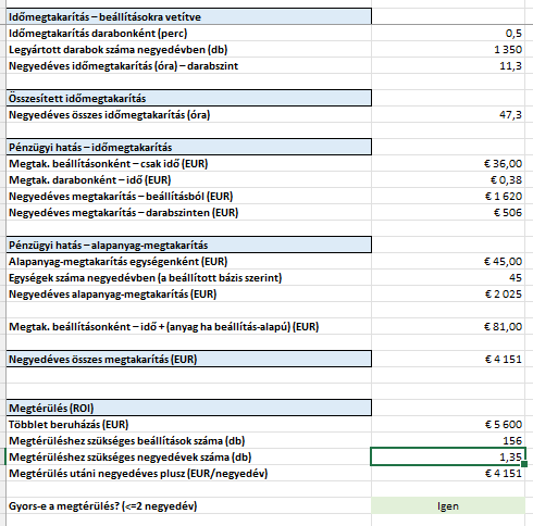 A kalkuláció drámaian rávilágít, hogy amikor a gépek nem várnak, a mellékidők eltűnnek, és az előkészítés párhuzamosan zajlik, a megtérülés szinte azonnali.
