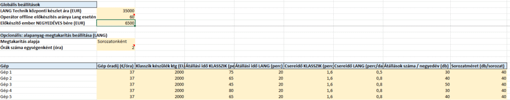 A második kalkuláció már nem egy gépre készült, hanem a valós üzemek működését akarta leképezni. Olyan helyzetet, ahol több gép dolgozik párhuzamosan, és a cél már nem csak az, hogy egy gépen villámgyors legyen az átállás, hanem hogy egyetlen perc se menjen kárba az egész műhelyben.